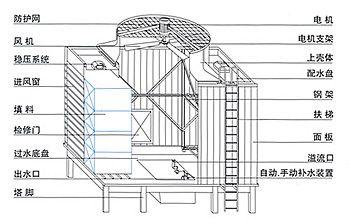 简称闭式塔。以其低噪声、低能耗等优点,越来越成为封闭式冷却塔的常用塔型。图1为横流闭合式冷却塔结构示意图。液体在管道中的热量通过管壁传递到管外流动的喷淋水,然后通过喷淋水传递到空气中。所谓横流,就是从塔体侧面进气,换热器内空气流动方向与喷水方向接近为90°,空气对管片的横扫,但管内被冷却水在管程总方向与气流方向相反,仍然是逆流。尽管换热模块各不相同,但各不相同,各有其特点,各换热管一般是由平行直管和U形弯头组成的一组蛇形管片,各管片并联在竖直集管上,每个管片与水平面有一个的倾角,使冷却水入口侧略高于被冷却水出口侧,以便在停用时放水,打开时排气,同时利于导风(风机设在塔顶抽吸)。